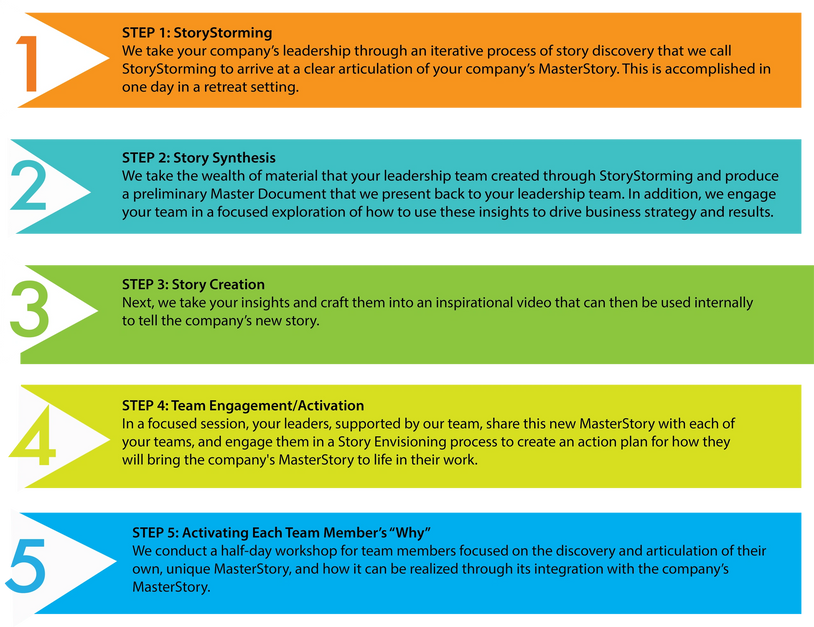 In contrast to brainstorming, StoryStorming takes your leadership team on an exploration and excavation of your company in greater depth, revealing deeper truths, and most importantly, greater possibilities. "Story" is our native language. It's how we relate to the world and our experience in it. To assist companies to discover their MasterStory, we harness the power of storytelling, whether it be through the telling of stories about things that have occurred in the organization and asking what these stories reveal about the most valuable qualities of the organization; or, through the act of creative storytelling about characters in the future who are experiencing the company’s ideal self. Through the debriefing of those experiences, both real and imagined, we help you to discover the deeper truth and reason for the being of your company.